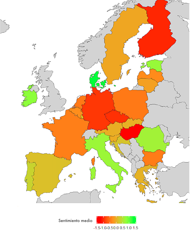 La aplicación de estas herramientas nos permitió observar las variaciones entre países. Grecia, Croacia y Bulgaria presentan una alta cobertura mediática y un sentimiento más negativo. En cambio, Dinamarca, Irlanda y Portugal muestran un sentimiento mediático más positivo. Por su parte, en los países del Norte de Europa, Suecia, Finlandia y Dinamarca, la cobertura del tema es menor, con menos artículos por habitante.