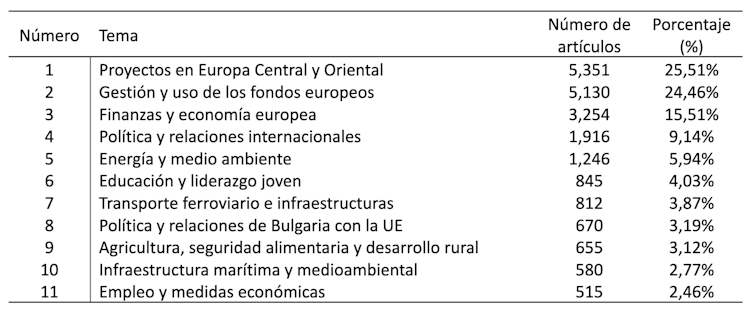 Croacia y Bulgaria les siguen de cerca, con un 15,12 % y un 11,25 % del total de artículos, respectivamente. Esta atención puede deberse a su reciente adhesión a la UE, y la importancia de los fondos europeos en las inversiones en infraestructuras y desarrollo económico.